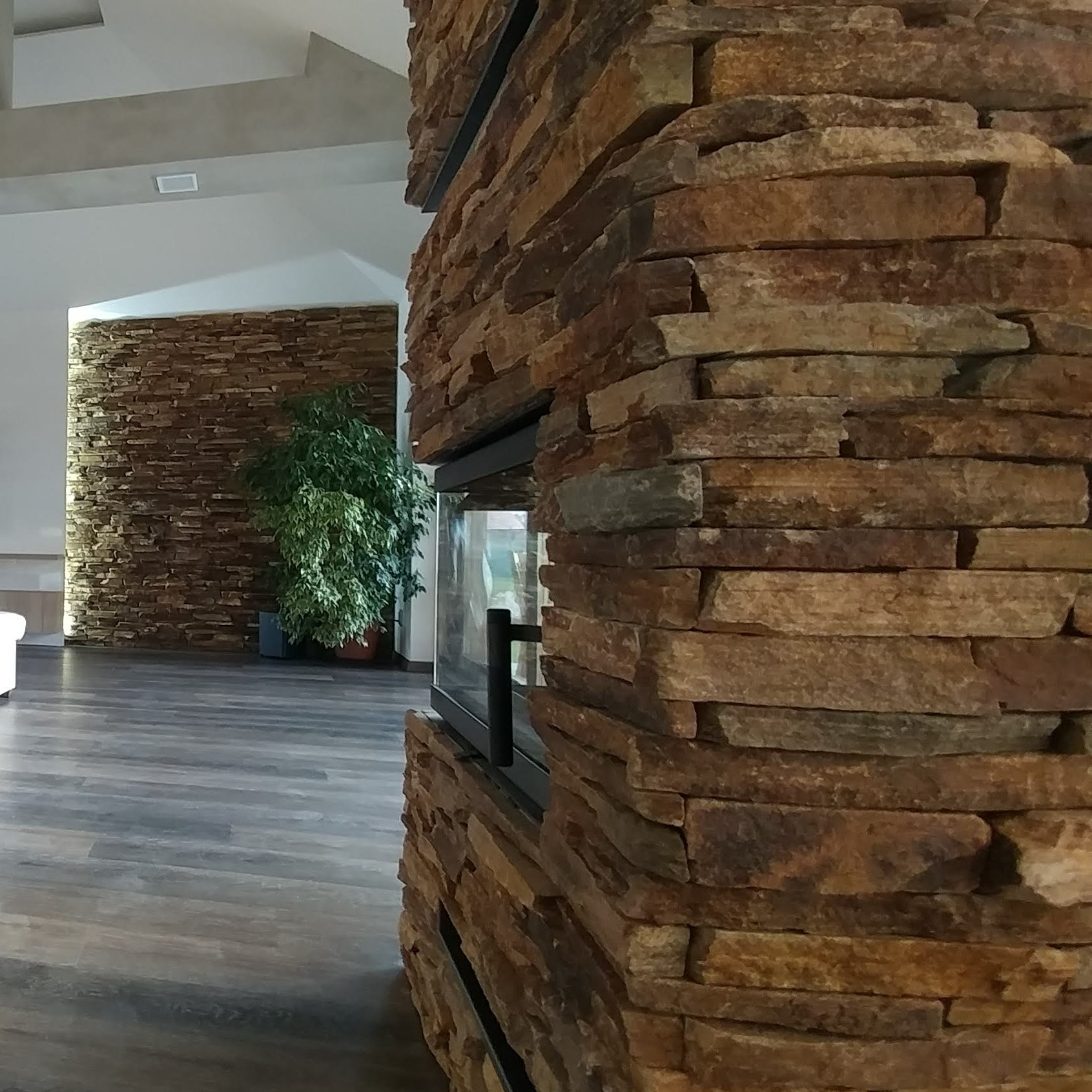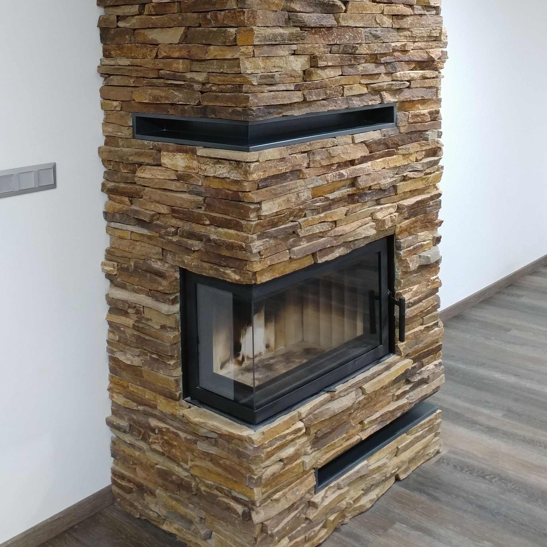 Použití kamene do interiéru je poslední dobou velmi oblíbené, jak u obkladového kamene, tak u dlažeb z přírodního kamene, jako je rula, kvarcit, pískovec a další. Přírodní kamenný obklad je vždy dominantou interiéru například metalické filety u našeho spokojeného zákazníka zdobí krb a stěnu v obývacím pokoji.